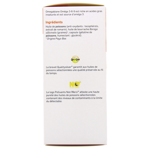 Omegabiane Oméga 3-6-9 du laboratoire Pilege est formulé à base d'huiles de poissons et de bourrache. Ce complément alimentaire est riche en acides gras insaturés et est source d'oméga 3.
