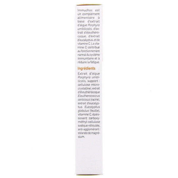 Immuchoc du laboratoire Pileje est un complément alimentaire formulé à base d'extrait d'algue Porphyra umbilicalis, d'extrait d'éleuthérocoque, d'extrait d'eucalyptus et de vitamine C pour contribuer au fonctionnement normal du système immunitaire et à réduire la fatigue.