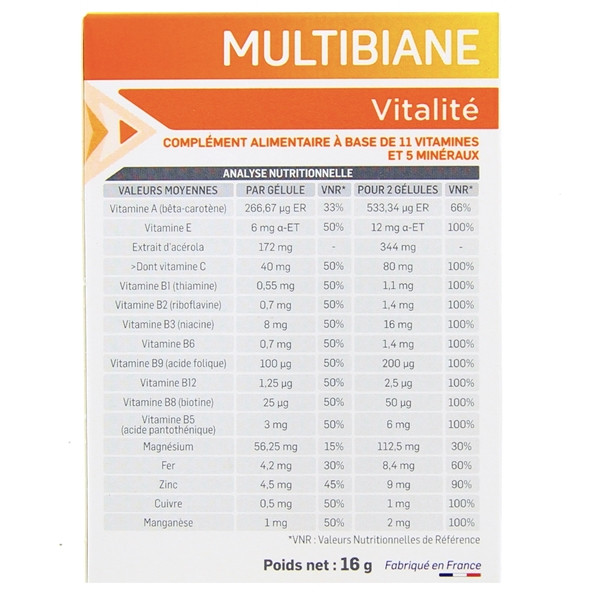 Chaque gélule contient une quantité précise d'ingrédients actifs, et il est important de maintenir un équilibre approprié pour une utilisation sûre et efficace. L'administration des gélules avec de l'eau garantit une ingestion optimale et favorise une absorption efficace des ingrédients multivitaminés. Vous devez également consommer une variété d'aliments nutritifs en complément du Multibiane 30x gélules.