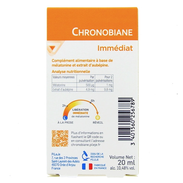 Chronobiane Immédiat du laboratoire Pileje est un complément alimentaire formulé à base de mélatonine et d'extrait d'aubépine pour contribuer à réduire le temps d'endormissement et à atténuer les effets du décalage horaire.
