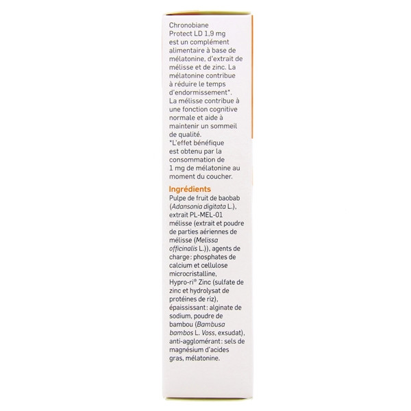 Chronobiane Protect LD 1,9 mg du laboratoire Pileje est formulé à base de mélatonine, d'extrait de mélisse et de zinc pour contribuer à réduire le temps d'endormissement et à une fonction cognitive normale. De plus il aide à maintenir un sommeil de qualité.