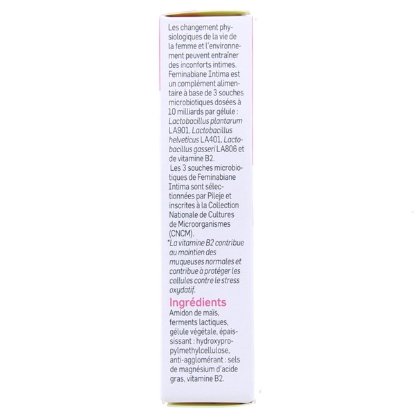 Le complément alimentaire Feminabiane Intima du laboratoire Pileje est formulé à base de vitamine B2 et de 3 souches microbiotiques dosées à 10 milliards :