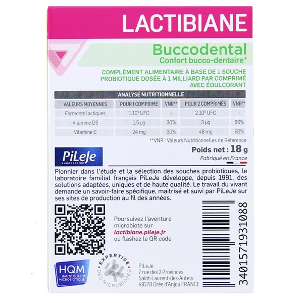 Lactibiane Buccodental du laboratoire Pileje est formulé à base de la souche microbiotique Lactobacillus paracasei LA802, de vitamines C et D. Ce complément alimentaire contribue à la formation normale de collagène pour assurer la fonction normale des dents et gencives ainsi qu'au maintien d'une dentition normale.