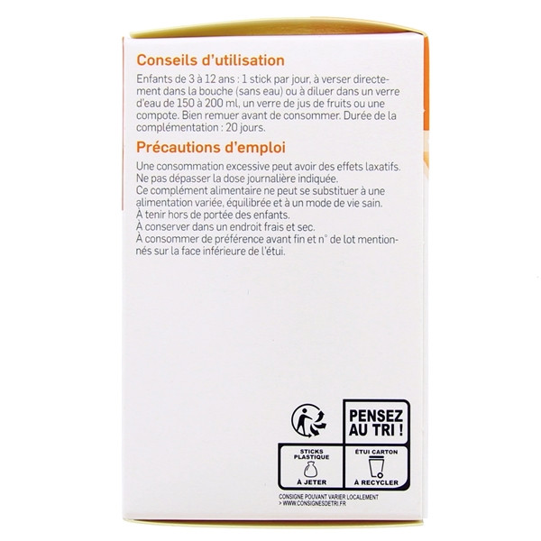 - Donnez 1 stick par jour à votre enfant. Versez directement le contenu dans sa bouche, sans eau ou diluez-le dans un liquide froid (150 à 200 ml), ou dans une compote.