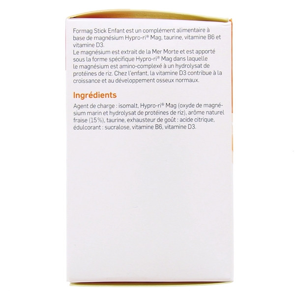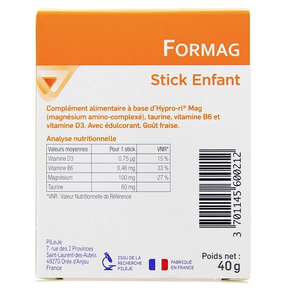 Formag Stick Enfant du laboratoire Pileje est un complément alimentaire formulé à base d'oxyde de magnésium Hyprori®Mag, de taurine, de vitamines B6 et D3 pour contribuer à la croissance et au développement osseux normaux des enfants.