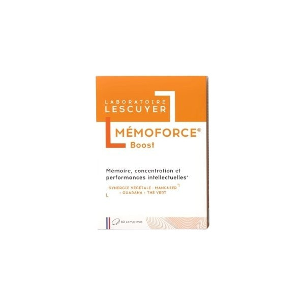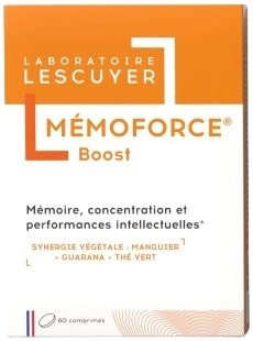 Le complément alimentaire Mémoforce Boost du Laboratoire Lescuyer est destiné aux adultes et étudiants lors de périodes d'activité intellectuelle intense (examens, révisions, activité professionnelle intense) pour stimuler leurs performances intellectuelles. Il favorise la mémoire, la concentration et les capacités d'apprentissage.