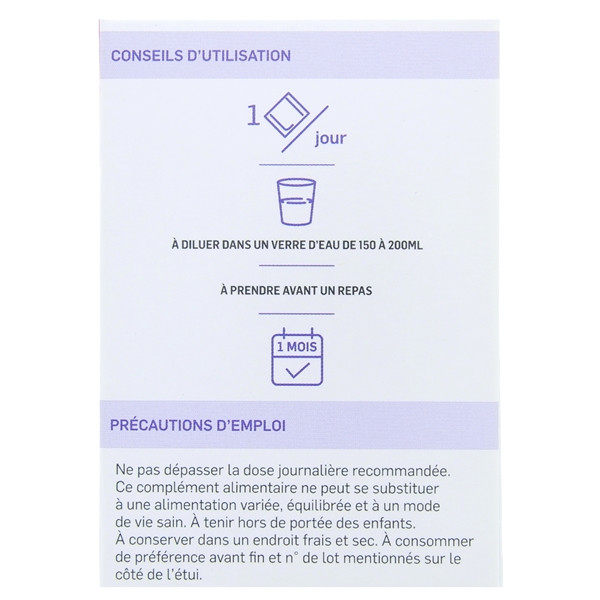 Disponible en boîte de 30 sachets de 2,5 g. (Cure de 1 mois).
