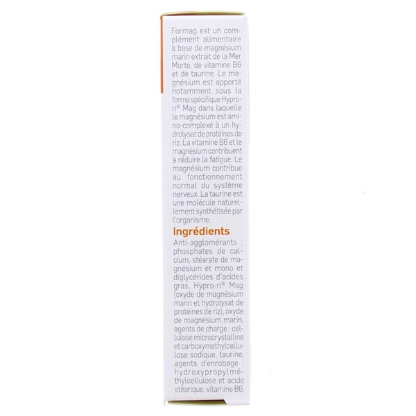 Formag est composé de magnésium extrait d'eau de mer et de vitamine B6 qui contribuent au fonctionnement normal du système nerveux et à réduire la fatigue.