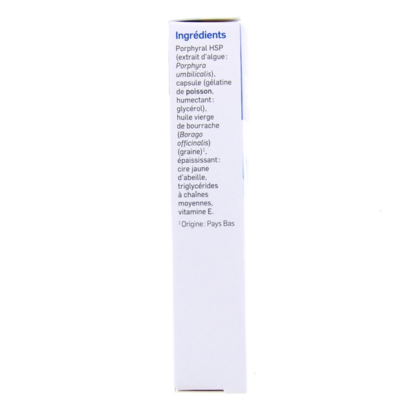 Porphyral HSP (extrait d'algue : Porphyra umbilicalis), capsule (gélatine de poisson, humectant : glycérol), huile vierge de bourrache (Borago officinalis) (graines)*, épaississant : cire jaune d’abeille, triglycérides à chaînes moyennes, vitamine E.