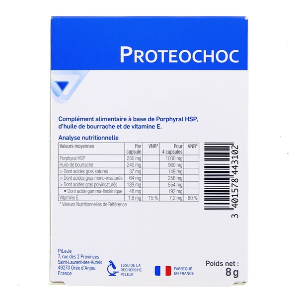 Proteochoc est composé de Porphyral HSP®, un ingrédient breveté issu d’une algue alimentaire récoltée sur le littoral breton, d'huile de bourrache et de vitamine E. Proteochoc participe à la protection cellulaire.