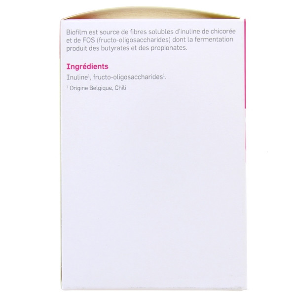 Biofilm est riche en fibres solubles d’inuline de chicorée et de FOS (fructo-oligosaccharides) dont la fermentation produit des butyrates et des propionates.