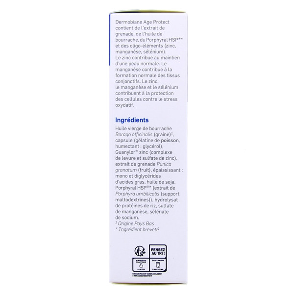 Dermobiane Age Protect est un complément alimentaire à base d'huile de bourrache(oméga 6), de grenade, d'oligo-éléments(zinc, manganèse, sélénium) et de Porphyral HSP, un ingrédient breveté par PiLeJe.