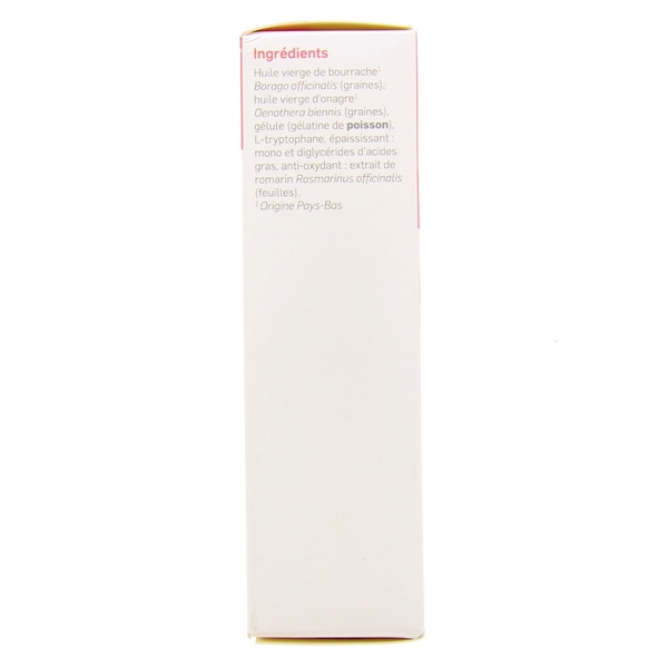 Huile vierge de bourrache* Borago officinalis (graines), huile vierge d’onagre1 Oenothera biennis (graines), gélule (gélatine de poisson), L-tryptophane, épaississant : mono et diglycérides d’acides gras, anti-oxydant : extrait de romarin Rosmarinus officinalis (feuilles).