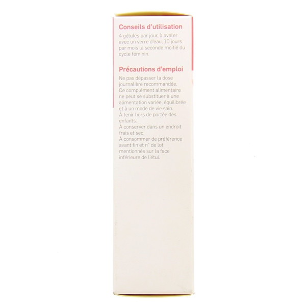 4 gélules par jour (2 le matin et 2 le soir, à prendre au cours du repas), 10 jours par mois la seconde moitié du cycle féminin.