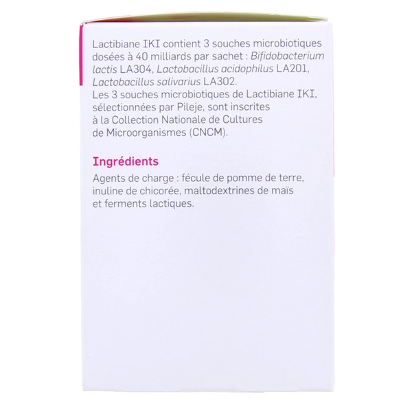 Pour un confort digestif optimal et le renforcement de la flore intestinal, les laboratoires Pileje mettent à votre disposition le complément alimentaire Lactibiane Iki dans une boite de 30 sachets de 3 g. Il renferme 4 souches de ferments probiotiques et 3 souches microbiotiques concentrées à 40 milliards soigneusement sélectionnés pour réduire considérablement les risques de troubles digestifs.