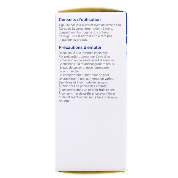 Émulsifiant : lécithine de soja,Ubiquinol Kaneka Ubiquinol™, triglycérides à chaines moyennes, gélule (gélatine de poisson, colorant : dioxyde de titane), vitamine E, antioxydant : extrait de romarin Rosmarinus officinalis(feuilles).