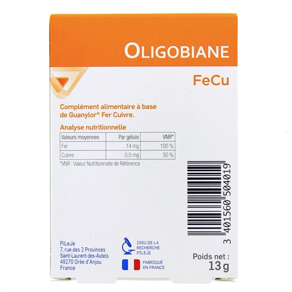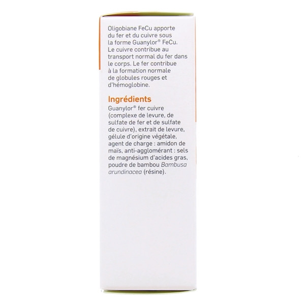 Oligobiane FeCu apporte du fer sous une forme spécifique brevetée Guanylor FeCu. 1 gélule apporte 100 % de la VNR en fer, soit 14 mg, et 50 % de la VNR en cuivre, soit 500 µg.