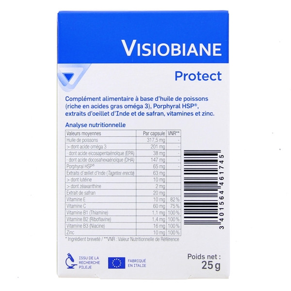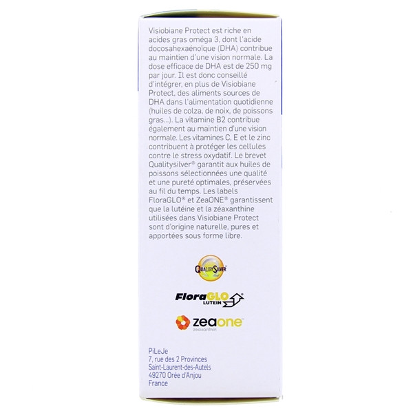 Visiobiane Protect est un complément alimentaire formulé à base d'acide gras oméga 3 DHA et de vitamine B2 contribuent au maintien d'une vision normale. La vitamine C, la vitamine E et le zinc contribuent à protéger les cellules contre le stress oxydatif.