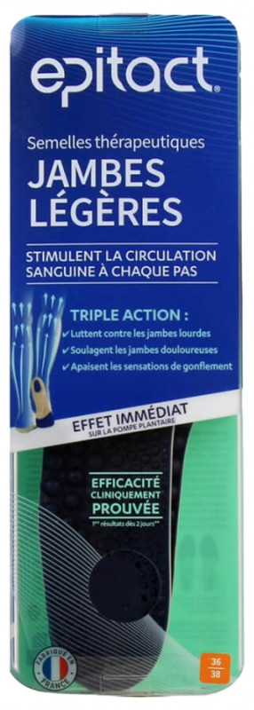 Les Semelles Thérapeutiques Jambes Légères d'Epitact permettent de stimuler la circulation sanguine à chaque pas. Ces semelles offrent une triple action : elles luttent contre les jambes lourdes, soulagent les jambes douloureusement et apaisent les sensations de gonflements.