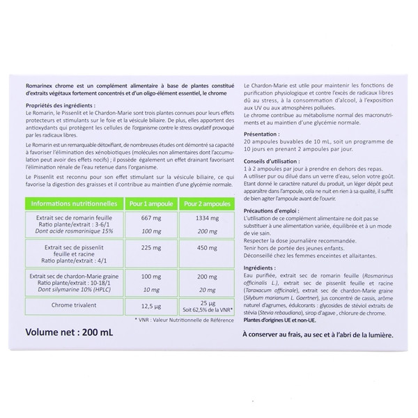 Le complément alimentaire Romarinex chrome élaboré par le laboratoire Dissolvurol est recommandé pour une amélioration de la fonction de purification de l'organisme. Il contient de l'extrait de romarin, de pissenlit, de chardon-Marie et de chrome réputés pour la protection et la stimulation du foie et de la vésicule biliaire.