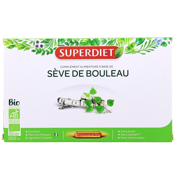 Pour aider l'organisme à s'adapter aux changements de saisons, les Laboratoires Superdiet ont élaboré un complément alimentaire fait uniquement de sève de bouleau. Cette sève est reconnue pour son effet reminéralisant sur l'organisme. La sève de bouleau contenue dans les ampoules renferme des oligo-éléments et minéraux, utilisés pour faciliter l'élimination des excès d'eau. D'origine biologique, la sève de Bouleau des laboratoires Superdiet a un goût neutre.