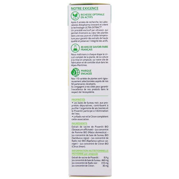 Le complément alimentaire Arkofluides Detox Bio facilite la détoxification de l'organisme et contribue à sublimer la peau. Il est particulièrement efficace lors d'un programme minceur anticipé au cours d'un changement de saison. Les principes actifs qui constituent ce complément alimentaire agissent sur plusieurs organes. Le Sureau noir a pour principales vertus de détoxifier et d'être dépuratif. Le pissenlit a pour fonction de faciliter l'élimination de l'eau. Le radis noir et le citron viennent compléter cette association.