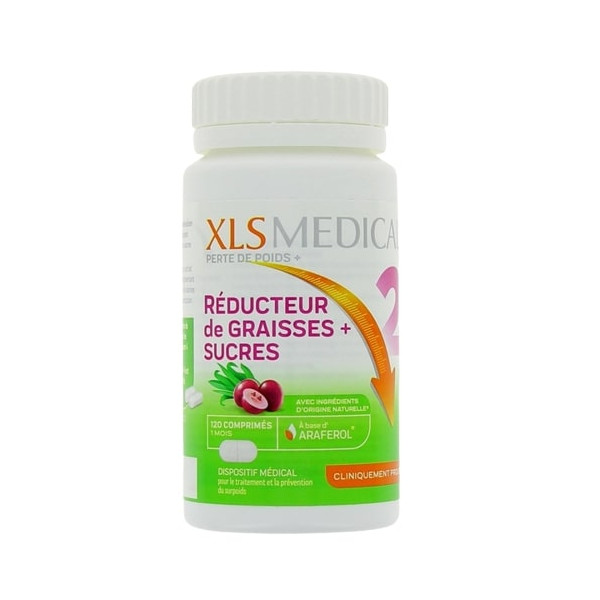 XLS Medical Perte de poids réducteur de graisses + sucres est un dispositif médical destiné à réduire l'absorption des calories issues des graisses et des sucres pour aider à perdre plus de poids. Il doit être pris en association d'une alimentation équilibrée et d'une activité physique régulière.