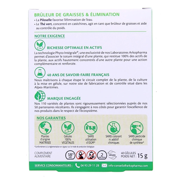 Arkopharma a élaboré Arkogélules Complexe Brûleur de graisse et Elimination pour aider à perdre du poids de manière bio. Il s’agit d’un complément alimentaire sous forme de gélules fortement concentrées en actifs d’origine naturelle. Il est formulé à base de thé vert et de piloselle, des actifs végétaux qui favorisent l’augmentation de la dépense énergétique et qui renforcent les fonctions d’élimination de l’organisme.