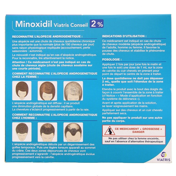 Ce médicament peut être utilisé sur les conseils de votre pharmacien. Néanmoins, un avis médical est nécessaire en cas de maladie cardiaque, même ancienne. Il n'est pas adapté aux chutes de cheveux brutales, consécutives à une maladie ou à un traitement médicamenteux. Il ne doit pas être appliqué ailleurs que sur le crâne.