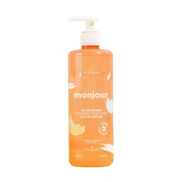 Monjour Eau Nettoyante Visage & Corps Sans Rinçage est formulée à base d’aloe vera bio, une plante connue pour ses bienfaits sur la peau. Ce soin aide à éliminer les impuretés incrustées dans le derme, hydrate la peau en profondeur pour l’adoucir. Il apaise également les irritations et protège l’épiderme sensible des enfants contre la poussière, la pollution, le vent, le froid... D’une texture légère et délicatement parfumée à l’essence de fleur d’oranger, cette eau nettoyante constitue une alternative efficace pour préserver la propreté et le confort des petits entre deux bains. Sa formule hypoallergénique a été testée en laboratoire afin de garantir sa haute tolérance cutanée. Conditionnement : flacon 400ml.