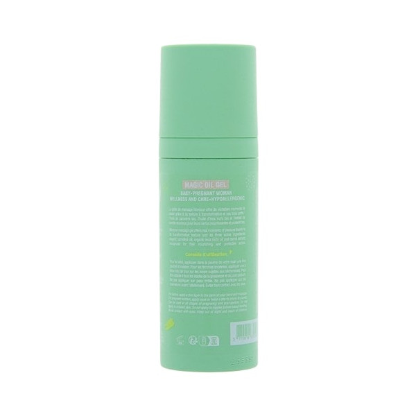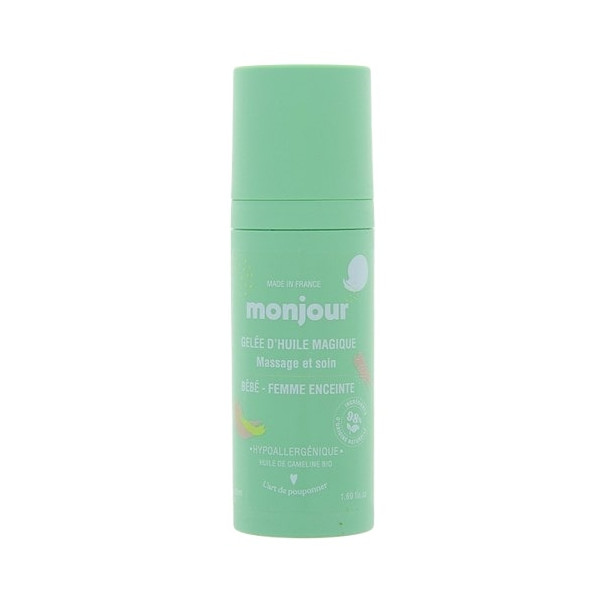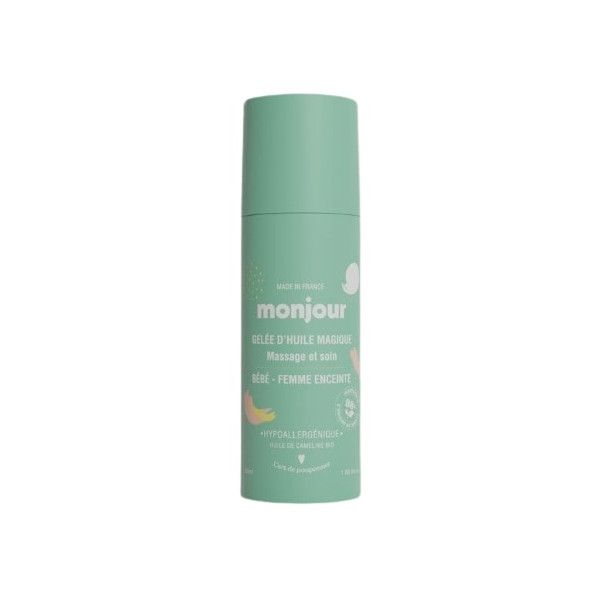 La Gelée d'Huile Magique Massage & Soin de la marque Monjour possède une formule hypoallergénique, à base de 98 % d'ingrédients d'origine naturelle dont de l'huile de cameline bio, pour convenir parfaitement aux bébés et aux femmes enceintes. Cette gelée nourrit, protège et offre un véritable moment de détente.
