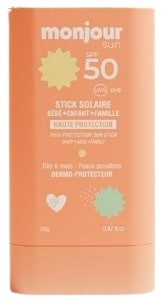 Le Stick Solaire Invisible SPF50+ de la marque Monjour protège efficacement le visage et les zones sensibles (oreilles, nez, grains de beauté…) contre les rayons UVA et UVB. Elle est adaptée aux enfants dès 6 mois et est compatible avec la grossesse.