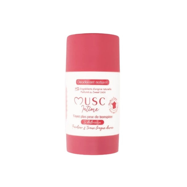Le déodorant Naturel Sweet Litchi en stick de la marque Musc Intime masque les mauvaises odeurs et laisse un délicieux parfum fruité et musqué. Il contient 95 % d'ingrédients d'origine naturelle.