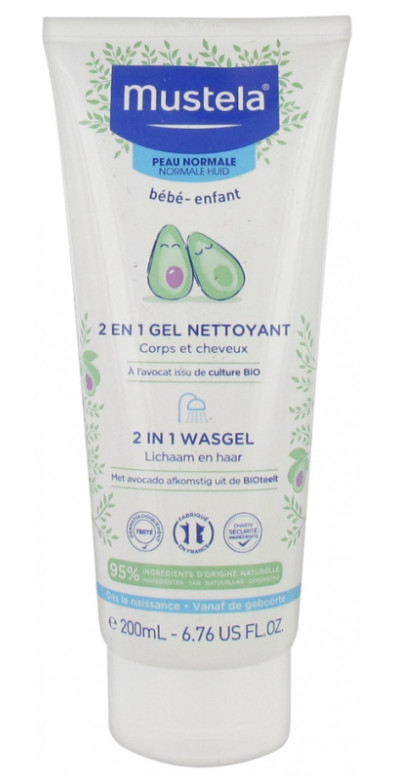 Le gel 2 en 1 corps et cheveux de la marque Mustela est recommandé pour nettoyer délicatement les cheveux et le corps de bébé. Il nettoie efficacement la peau de bébé sans l'agresser grâce aux tensio-actifs doux. Formulé sans savon, il ne présente pas de risques d'irritation pour la peau de bébé. Les vertus hydratantes de la glycérine stimulent le film hydrolipidique et augmentent sa résistance face aux multiples agressions externes. Le gel 2 en 1 de la marque Mustela facilite le démêlage des cheveux en améliorant considérablement la qualité du cuir chevelu.