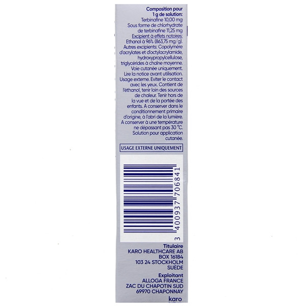 La solution doit être appliquée en fine couche, sur les orteils, sur la voûte plantaire et sur les côtés latéraux du pied, en commençant par les espaces entre les orteils. Laisser ensuite sécher la solution, sans masser, pendant 1 à 2 minutes jusqu'à formation d'un film. Il est recommandé d'appliquer la solution après avoir nettoyé et séché les pieds et d'attendre 24 heures avant de se laver à nouveau les pieds, afin de permettre une pénétration maximale du produit. Un tube permet de traiter les 2 pieds.