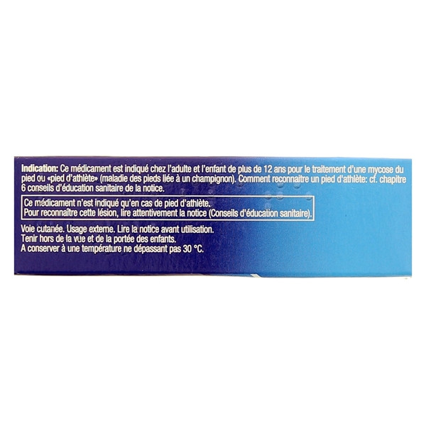 Ce médicament peut être utilisé sur le conseil de votre pharmacien si vous ressentez des démangeaisons ou des brûlures entre les orteils, associées ou non à des fissures. En l'absence d'amélioration une semaine après la fin du traitement, contactez votre médecin ; un prélèvement peut être nécessaire pour déterminer la cause des lésions.