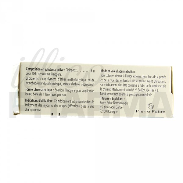 Mycoster vernis est un médicament indiqué pour traiter certaines mycoses des ongles. Mycoster vernis 8% ne nécessite pas d'ordonnance pour être acheté en ligne. Notre pharmacie en ligne propose le vernis Mycoster 8% en flacon de 3ml. Avant tout achat, il est nécessaire de consulter la notice de ce médicament.