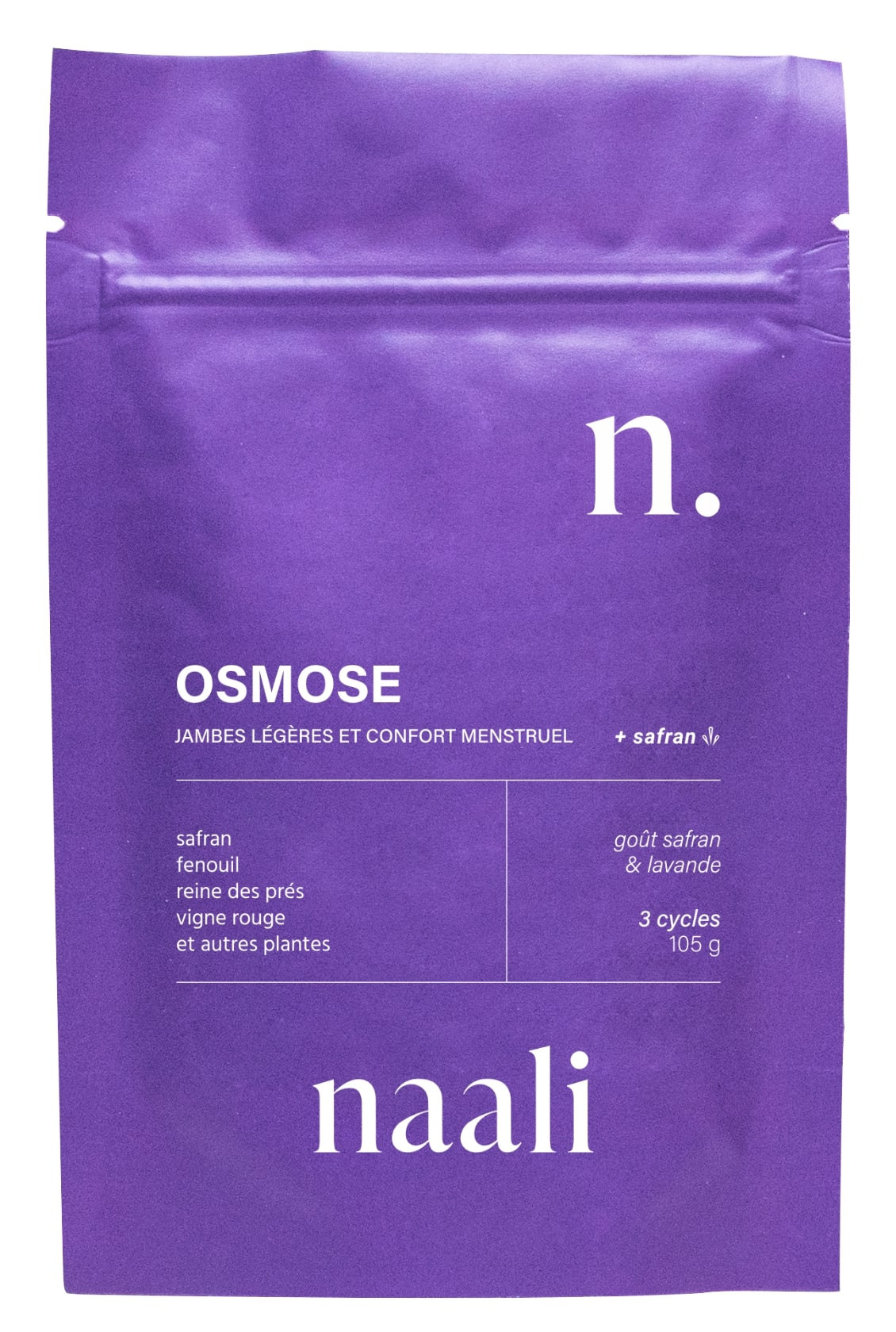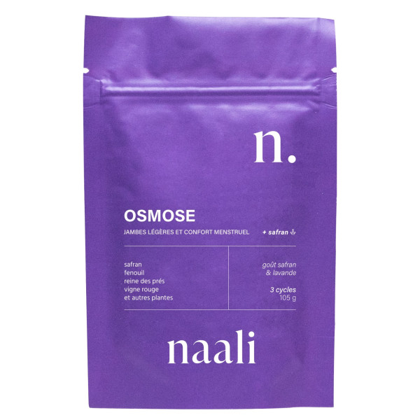 L'infusion Osmose Jambes Légères & Confort Menstruel de Naali est conditionnée dans un sachet de 150 g qui correspond à 30 infusions, soit 3 cycles mentruels.