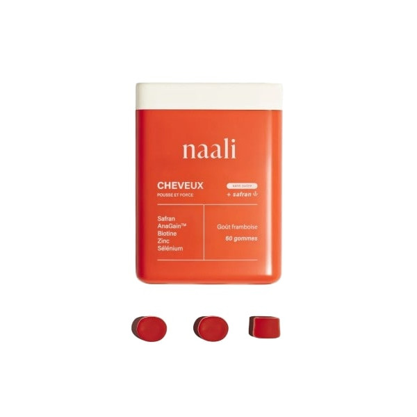 Le complément alimentaire pour lutter contre la chute de cheveux, accélérer la pousse des cheveux et renforcer les cheveux naturellement de la marque Naali est conditionné en pot de 60 gommes au goût de framboise pour une cure d'un mois.