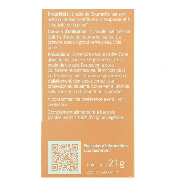 Pour une utilisation optimale, prenez une capsule le matin et une autre le soir, ce qui correspond à un apport de 1 g d’huile de bourrache par jour.