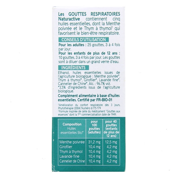 Les Gouttes Respiratoires Naturactive est une solution buvable aux huiles essentielles bio de menthe poivrée, de thym à thymol, de lavande fine, de cannelier de Chine et de giroflier pour le confort respiratoire.