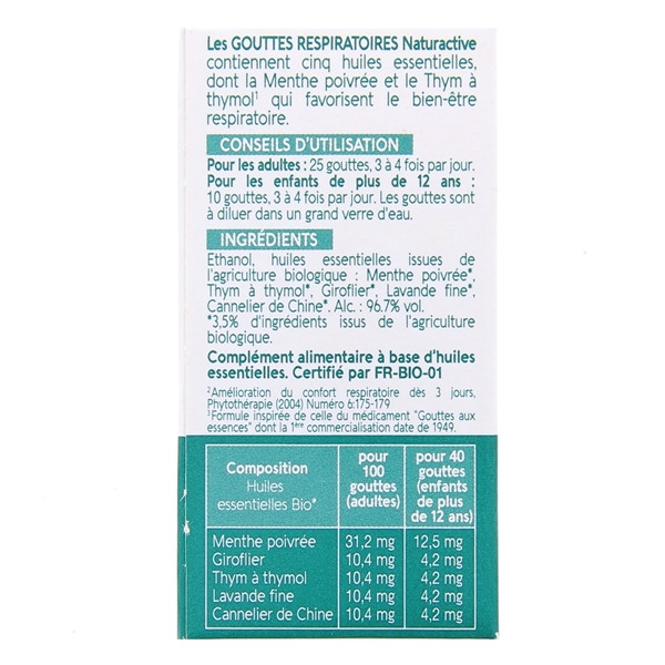 Les Gouttes Respiratoires de Naturactive est une solution buvable aux huiles essentielles de cannelier de Chine, de menthe poivrée, de thym à thymol, de lavande fine et de giroflier pour favoriser le bien-être respiratoire.