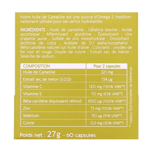 Huile de cameline, Gélatine bovine?; Acide ascorbique?; Affermissant : glycérine?; Epaississant : cire d’abeille jaune?; Sulfate de zinc monohydraté?; Emulsifiant : lécithine de colza?; Acétate de D,l alpha-tocopherol?; Bêta-carotène naturel sur huile d’olive?; Colorants : oxydes de fer noir et rouge, Oxyde de cuivre?; Extrait sec de melon?; Sélénite de sodium.