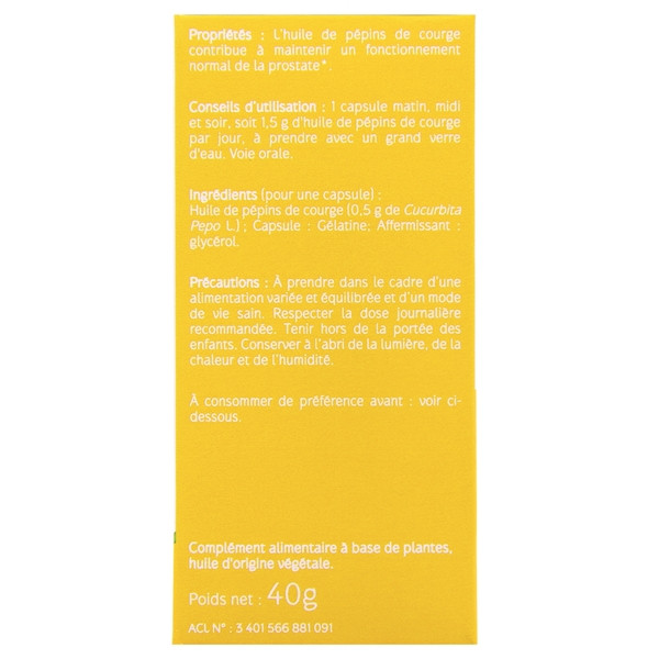 Pour une capsule : Huile de pépins de Courge (Cucurbita Pepo L) 0,5 g - Capsule : Gélatine, Glycérine.