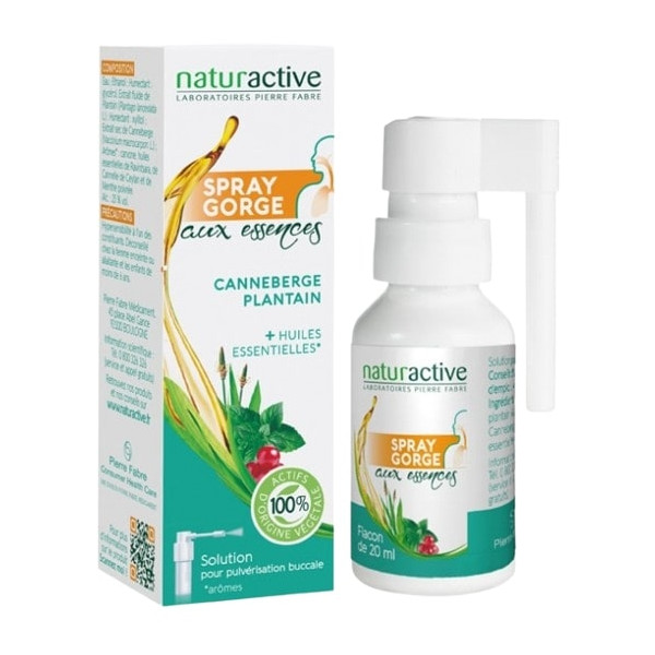 Le Spray Gorge aux essences du laboratoire Naturactive est formulé à base de Canneberge, de Plantain et d'huiles essentielles pour soulager rapidement et efficacement les maux de gorge.
