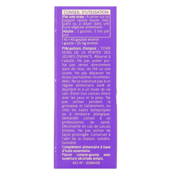 - Prise par voie orale : 2 gouttes chez l’adulte, à raison de 3 fois par jour. La prise se fait en les versant sur un support neutre (miel, sucre, pain) ou en les diluant dans de l’huile végétale alimentaire.