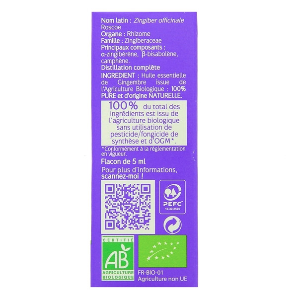 Fruit de l’expertise des laboratoires Naturactive, le complément alimentaire Huile Essentielle de Gingembre Bio a le mérite d’être 100 % pur et naturel. De plus, il est certifié biologique.