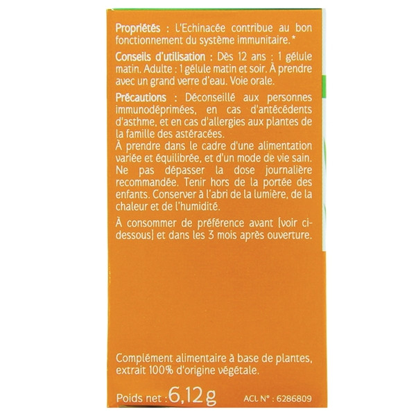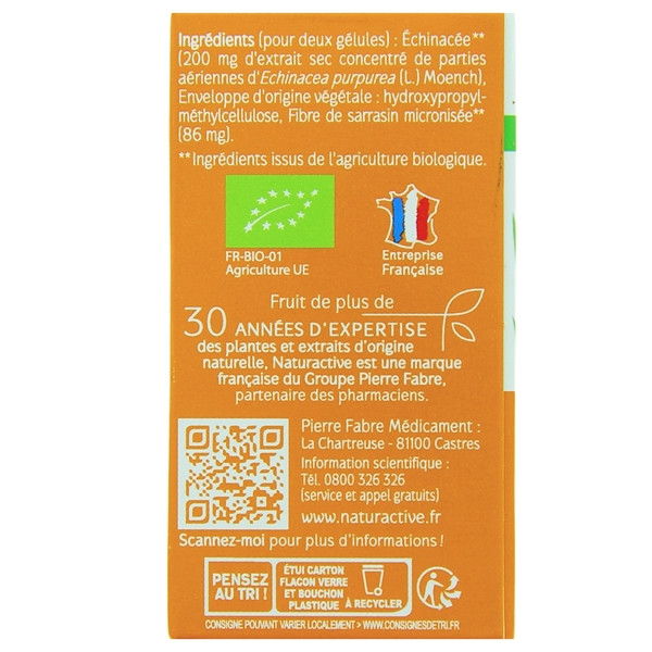 Naturactive Échinacée Bio gélules végétales contient toutes les molécules actives de la plante. Ce produit offre plusieurs intérêts en phytothérapie. Il exerce un effet immunostimulant : les composants de l’échinacée contribuent au renforcement des défenses immunitaires pendant les changements de saison et durant l’hiver. Ces actifs relèvent le taux de globules blancs lors d’infection et aident à lutter contre une éventuelle aggravation de la pathologie. Ces gélules peuvent aussi être ingérées en traitement de maladies virales ou bactériennes, ainsi qu’en prévention des rhumes. Ce remède naturel possède également des vertus anti-infectieuses et anti-inflammatoires. Il permet d’empêcher la prolifération de microbes et de favoriser la cicatrisation en cas d’irritation de la peau ou de plaie superficielle. Conditionnement : en boîte de 30 gélules.