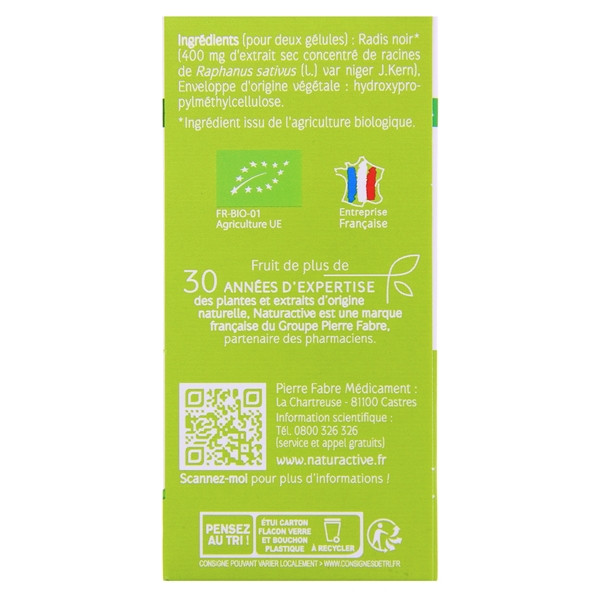 Les gélules Radis Noir Bio du laboratoire Naturactive sont conseillées en entretien pour aider à drainer et nettoyer le foie et la vésicule. Elles sont aussi bénéfiques en cas de digestion difficile après un excès alimentaire.