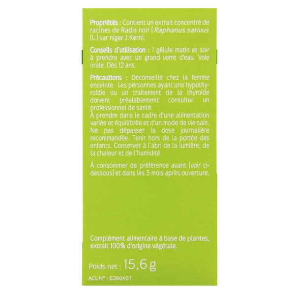 Radis noir (200 mg d’extrait sec de racine de Raphanus sativus L. var niger J.Kern) ; Gélatine ; Lactose ; Antiagglomérants : stéarate de magnésium, dioxyde de silicium [nano].